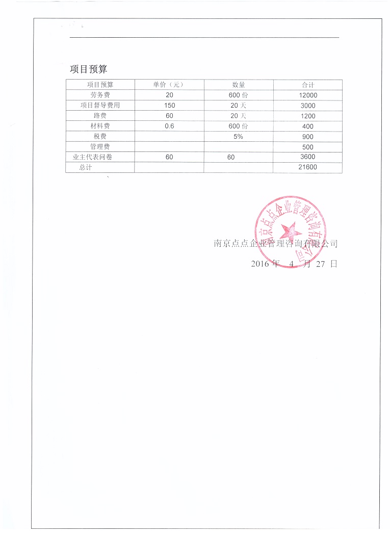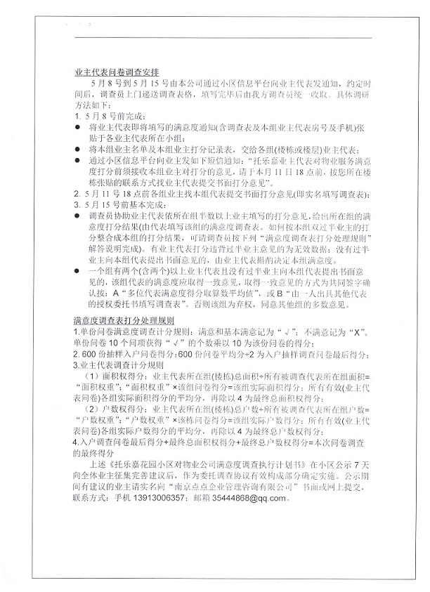 上述《托乐嘉花园小区对物业公司满意度调查执行计划书》在小区公示7天向全体业主征集完善建议后,作为委托调查协议有效构成部分确定实施。公示期间有建议的业主请实名向“南京点点企业管理咨询有限公司”书面或网上提交,联系方式:手机13913006357;邮箱35444868@qq.com。