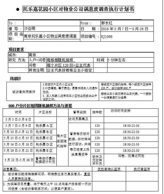 项目名称: 南京托乐嘉小区物业满意度调查 项目编号 : NJ1086