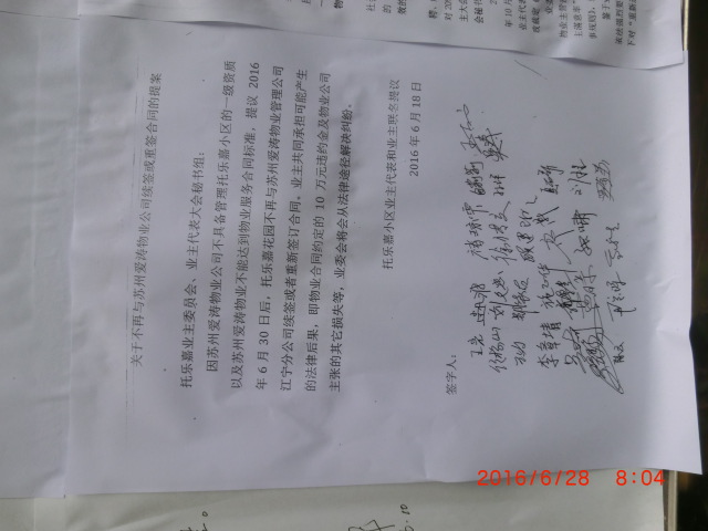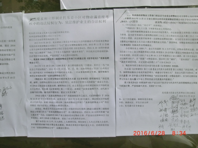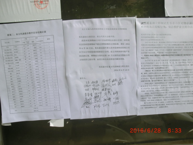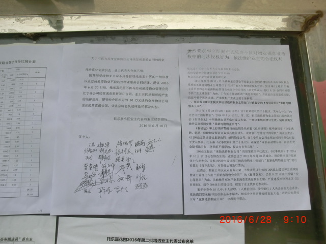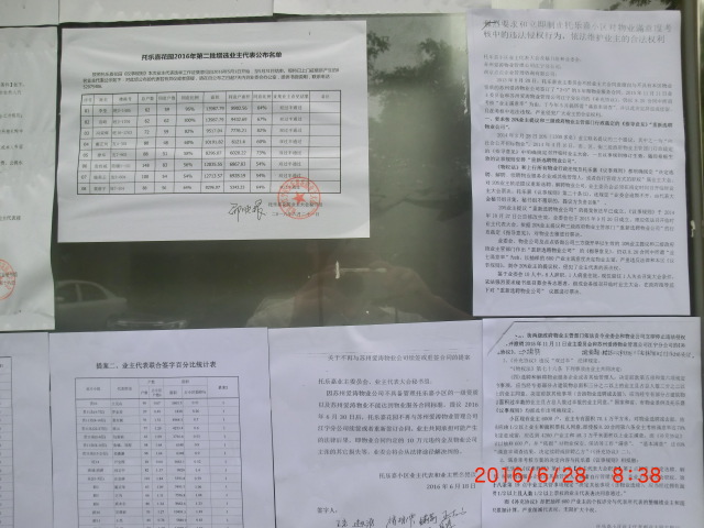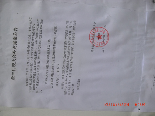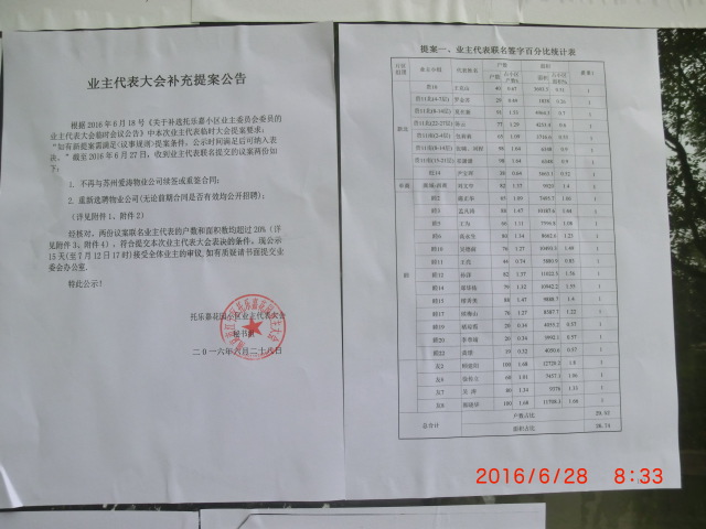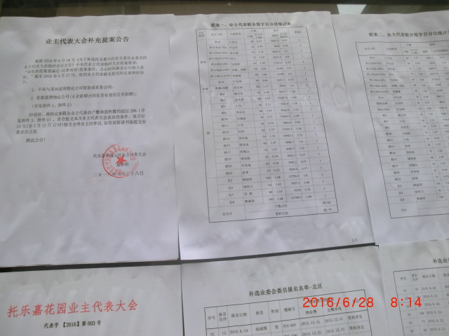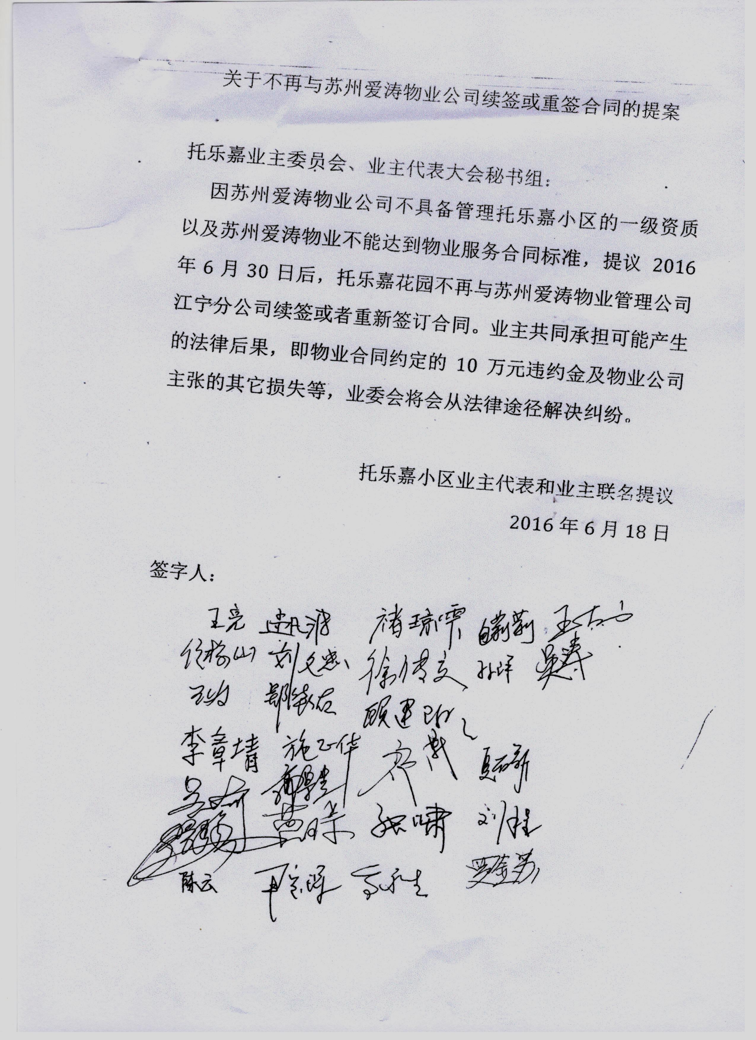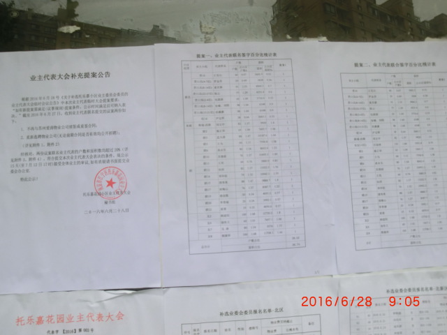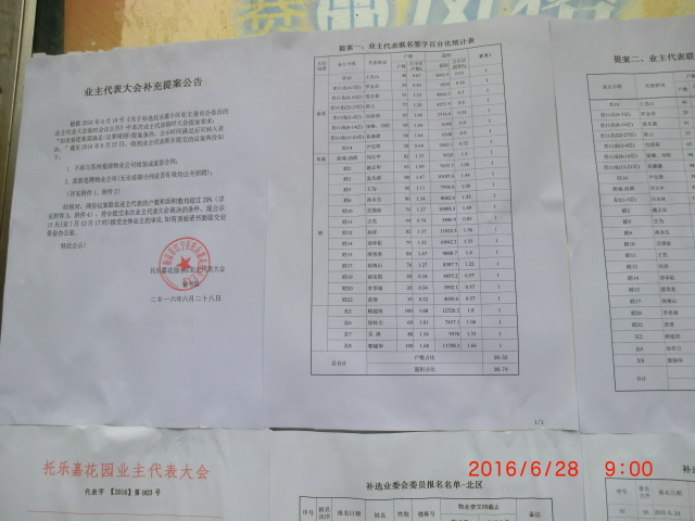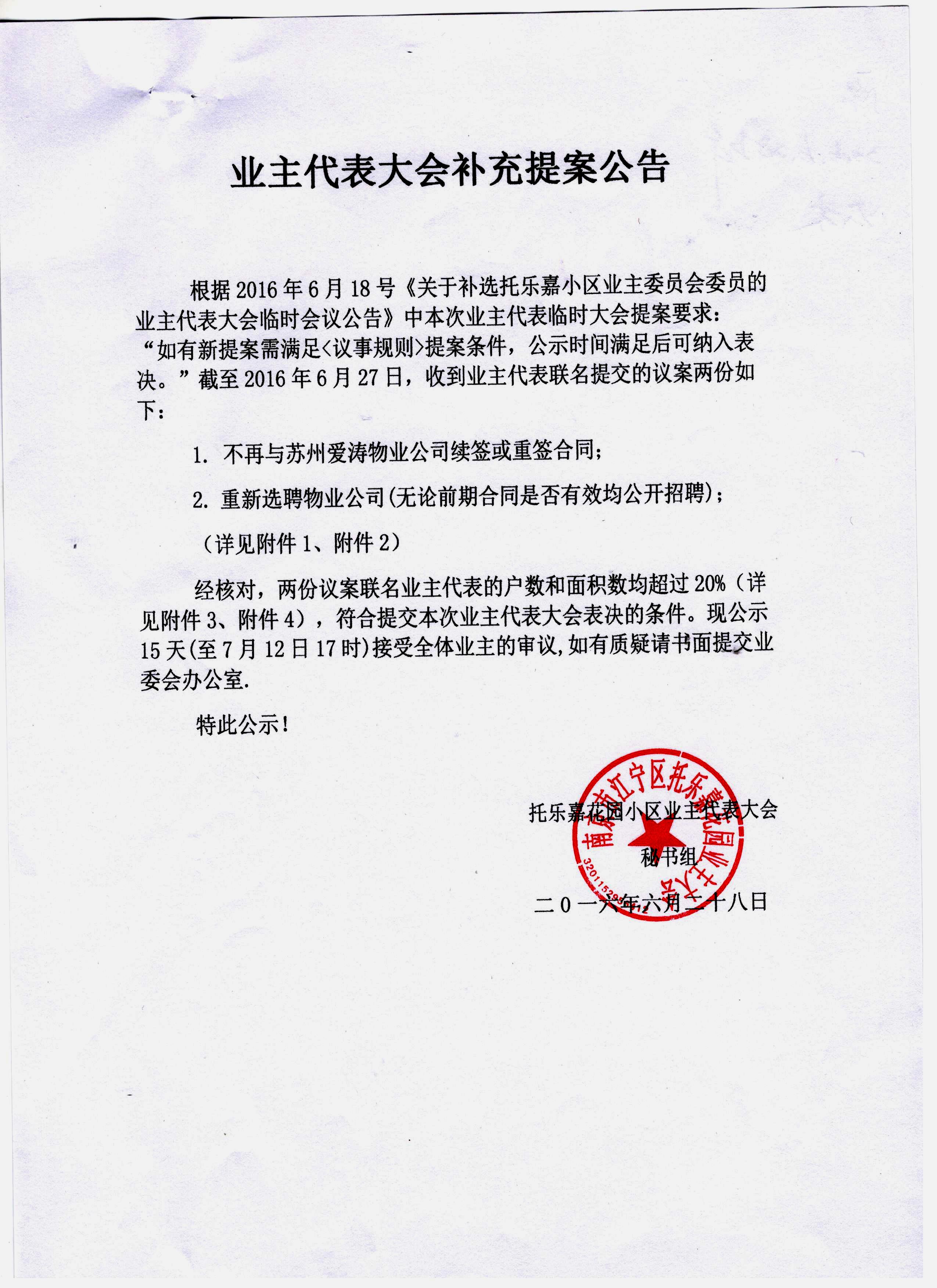 根据2016年6月18号《关于补选托乐嘉小区业主委员会委员的业主代表大会临时会议公告》中本次业主代表临时大会提案要求:“如有新提案需满足<议事规则>提案条件,公示时间满足后可纳入表决。”截至2016年6月27日,收到业主代表联名提交的议案两份如下:
