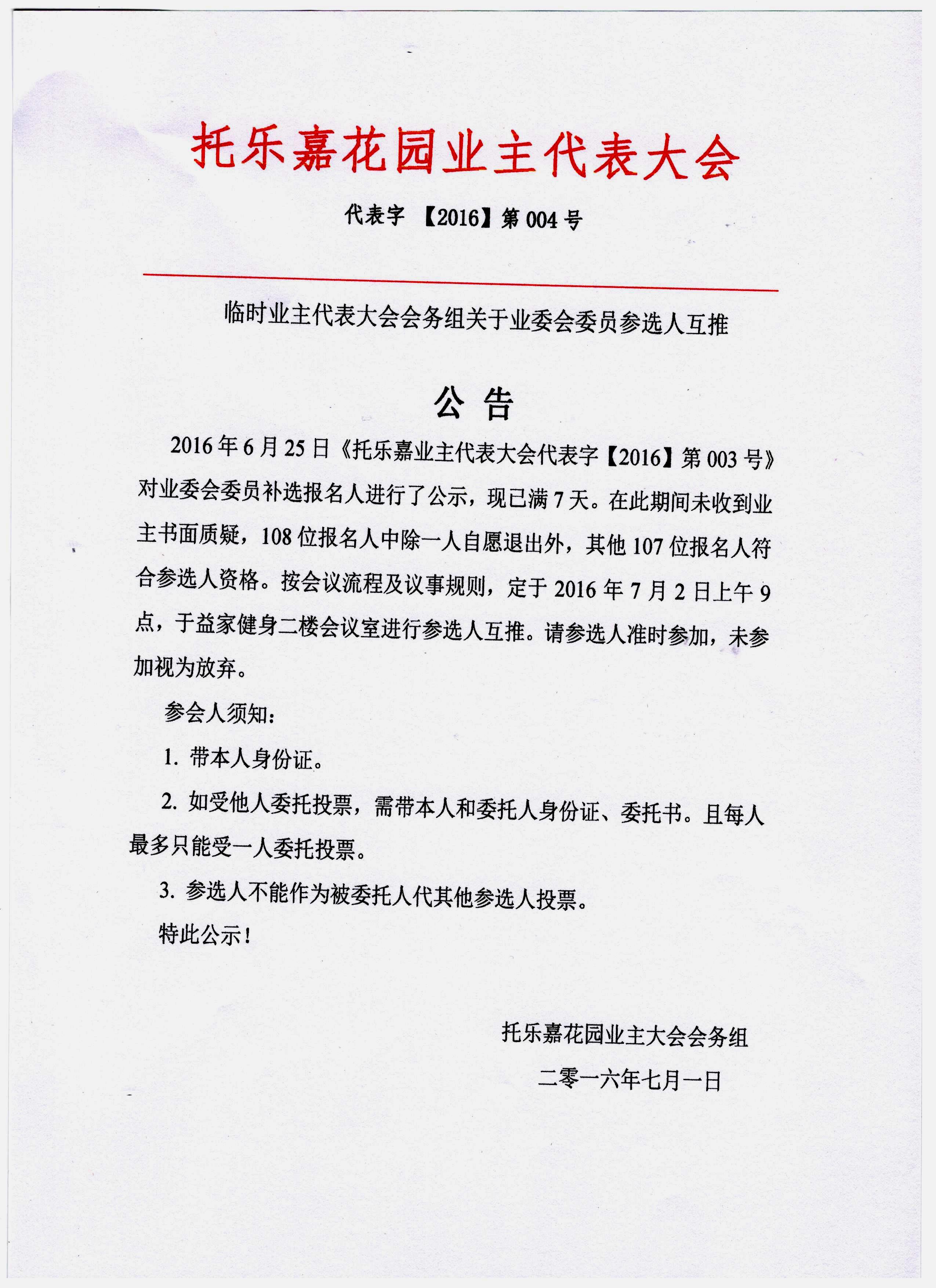 2016年6月25日《托乐嘉业主代表大会代表字【2016】第003号》对业委会委员补选报名人进行了公示,现已满7天。在此期间未收到业主书面质疑,108位报名人中除一人自愿退出外,其他107位报名人符合参选人资格。按会议流程及议事规则,定于2016年7月2日上午9点,于益家健身二楼会议室进行参选人互推。请参选人准时参加,未参加视为放弃。