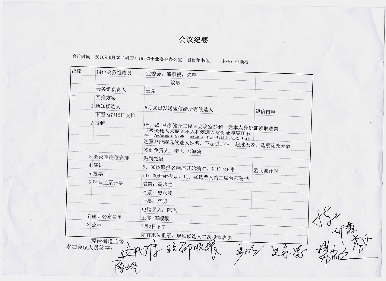会议时间:2016年6月30(周四)19:30于业委会办公室;召集秘书组; 主持:邵顺根