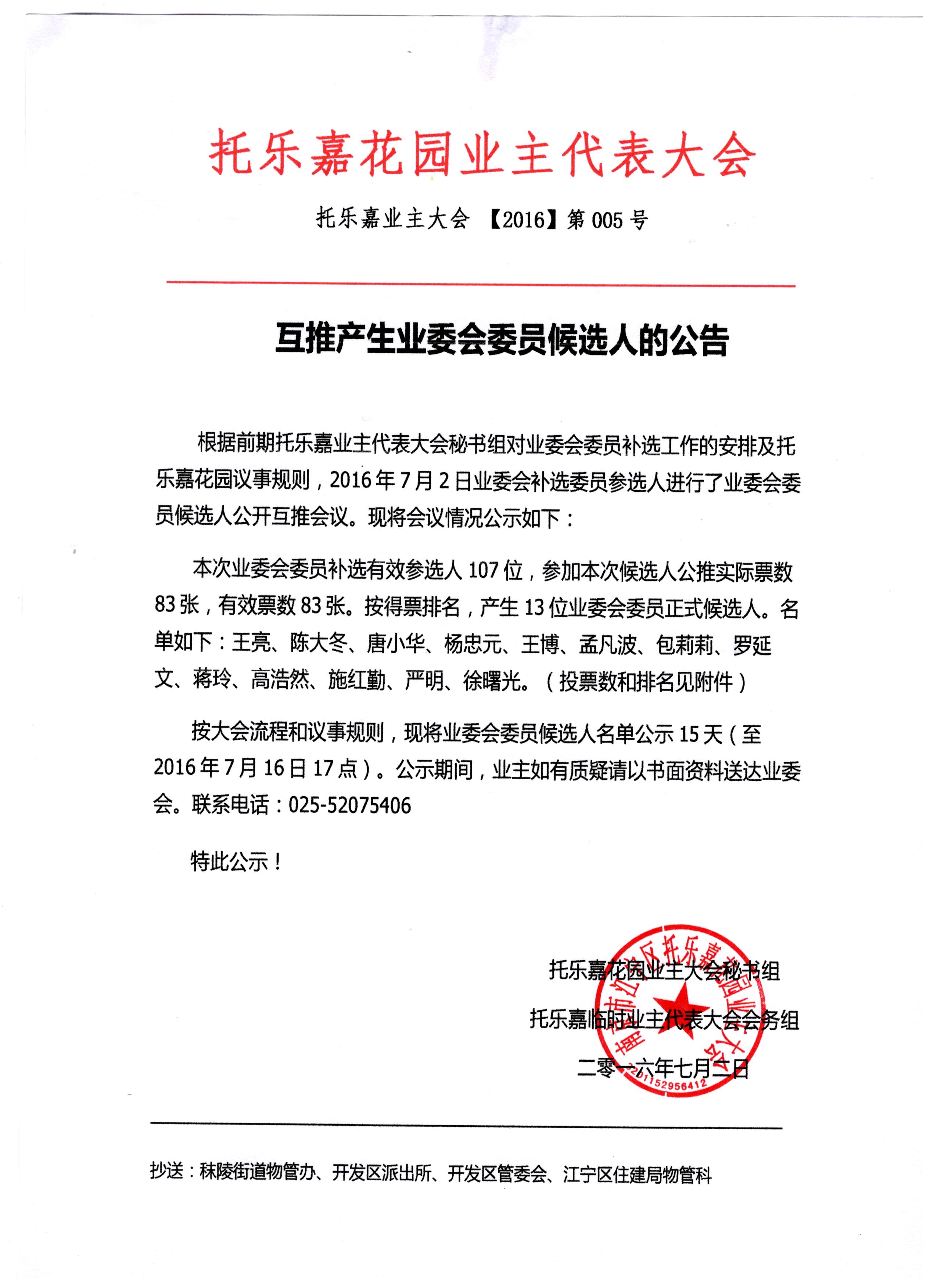 按大会流程和议事规则,现将业委会委员候选人名单公示15天(至2016年7月16日17点)。公示期间,业主如有质疑请以书面资料送达业委会。联系电话:025-52075406