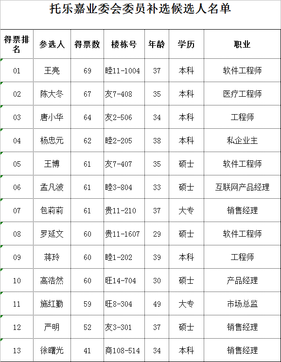 托乐嘉业委会委员补选候选人名单