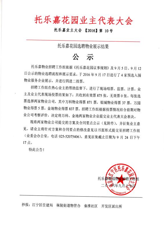 托乐嘉物业招聘工作组依据《托乐嘉花园议事规则》及9月5日、9月12日公示的物业选聘流程和展示要求,于2016年9月17日进行了4家预选入围物业服务企业展示,并进行四进二投票。