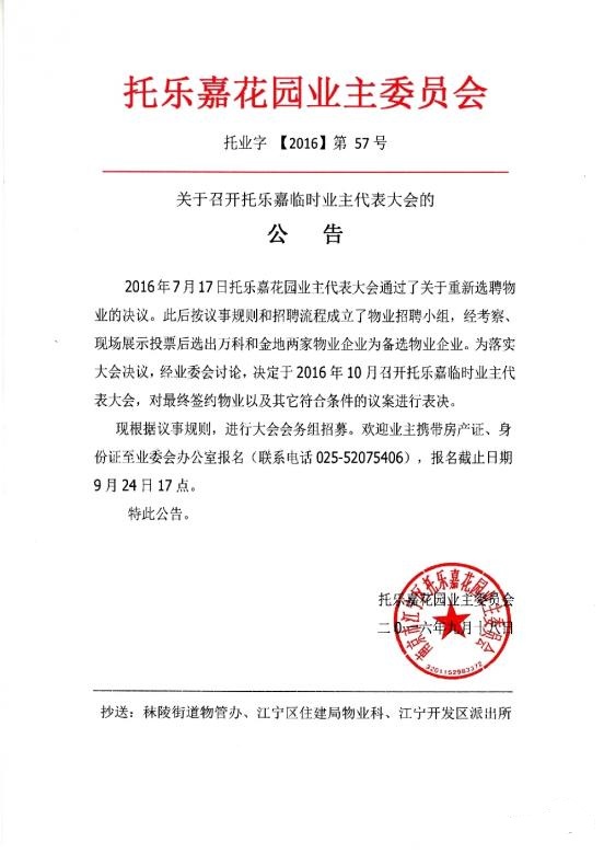 2016年7月17日托乐嘉花园业主代表大会通过了关于重新选聘物业的决议。此后按议事规则和招聘流程成立了物业招聘小组,经考察、现场展示投票后选出万科和金地两家物业企业为备选物业企业。为落实大会决议,经业委会讨论,决定于2016年10月召开托乐嘉临时业主代表大会,对最终签约物业以及其它符合条件的议案进行表决。