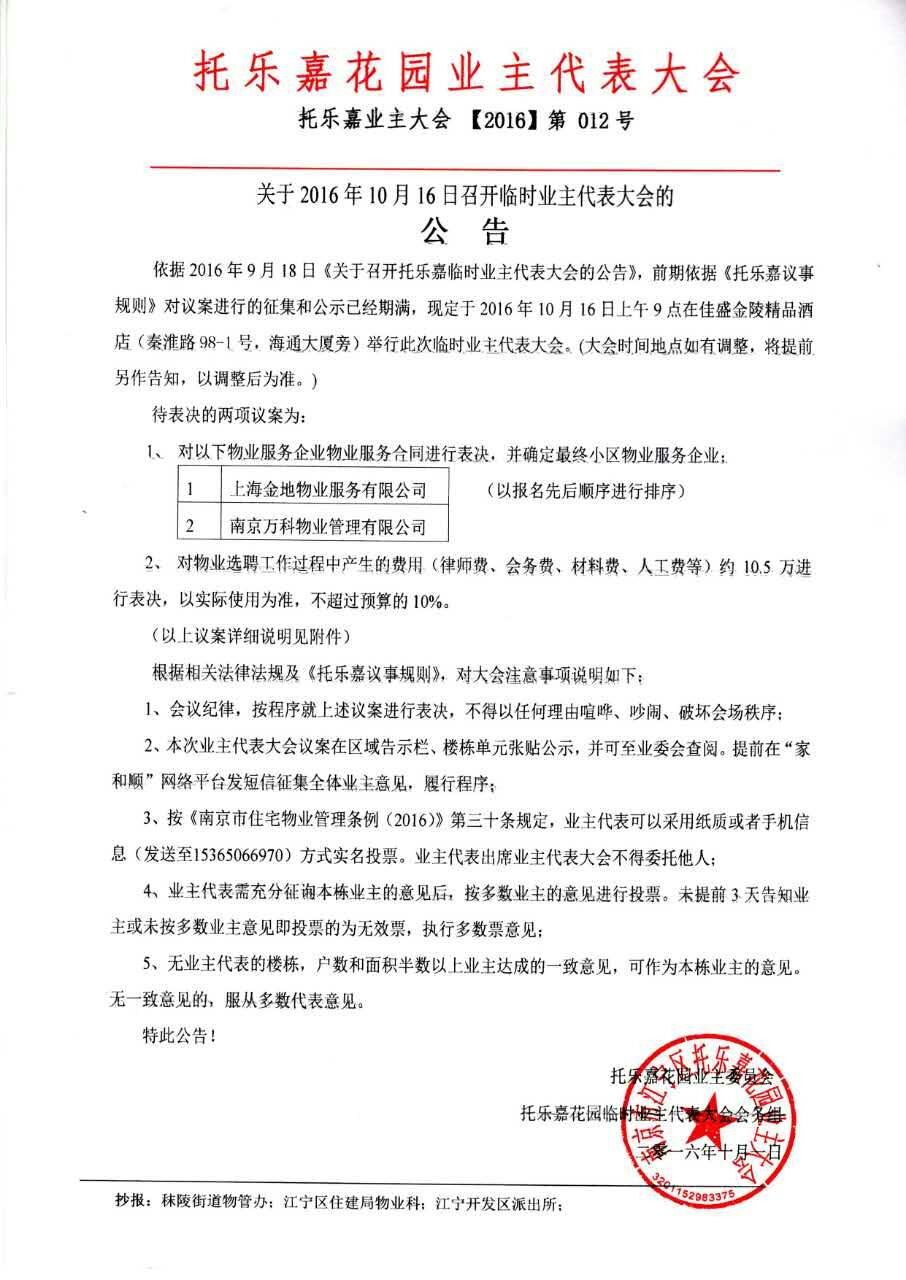 依据2016年9月18日《关于召开托乐嘉临时业主代表大会的公告》,前期依据《托乐嘉议事规则》对议案进行的征集和公示已经期满,现定于2016年10月16日上午9点在佳盛金陵精品酒店(秦淮路98-1号,海通大厦旁)举行此次临时业主代表大会。(大会时间地点如有调整,将提前另作告知,以调整后为准。)