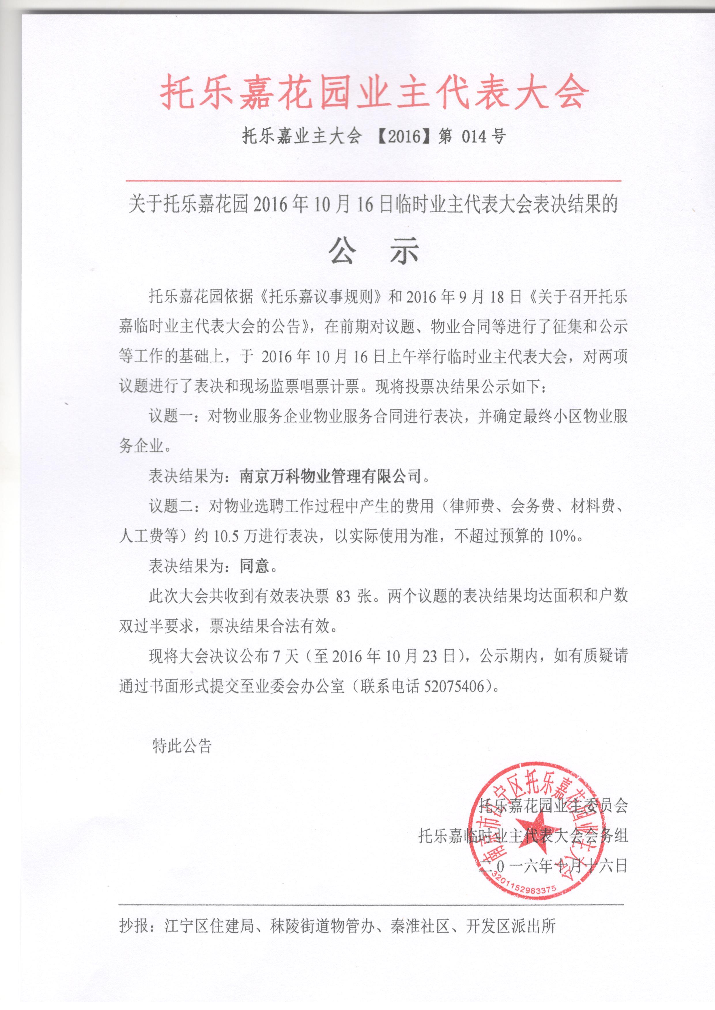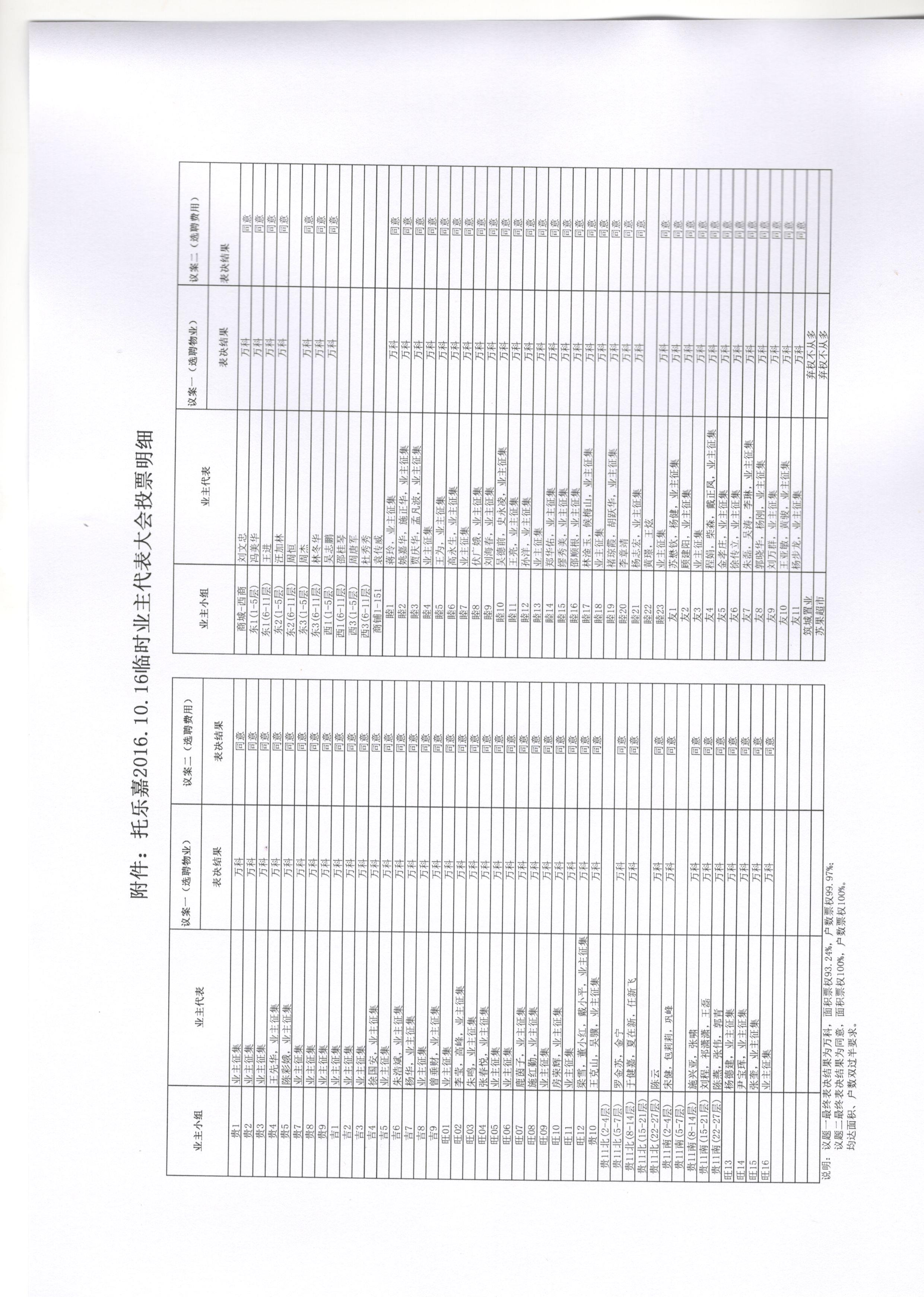 关于托乐嘉花园2016年10月16日临时业主代表大会表决结果的